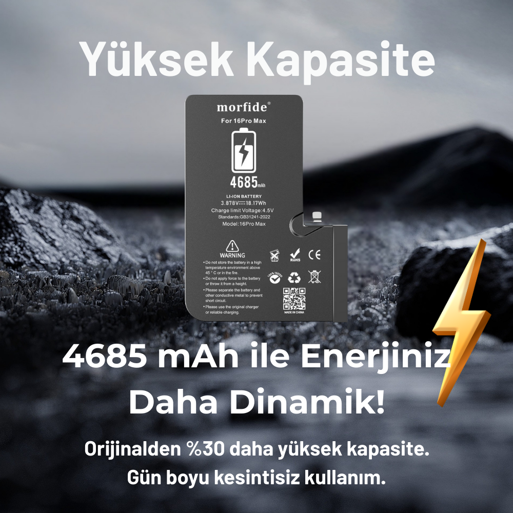 🔋 Morfide M-Max Serisi iPhone 16 Pro Max Uyumlu Yüksek Kapasiteli Pil (4685 mAh)