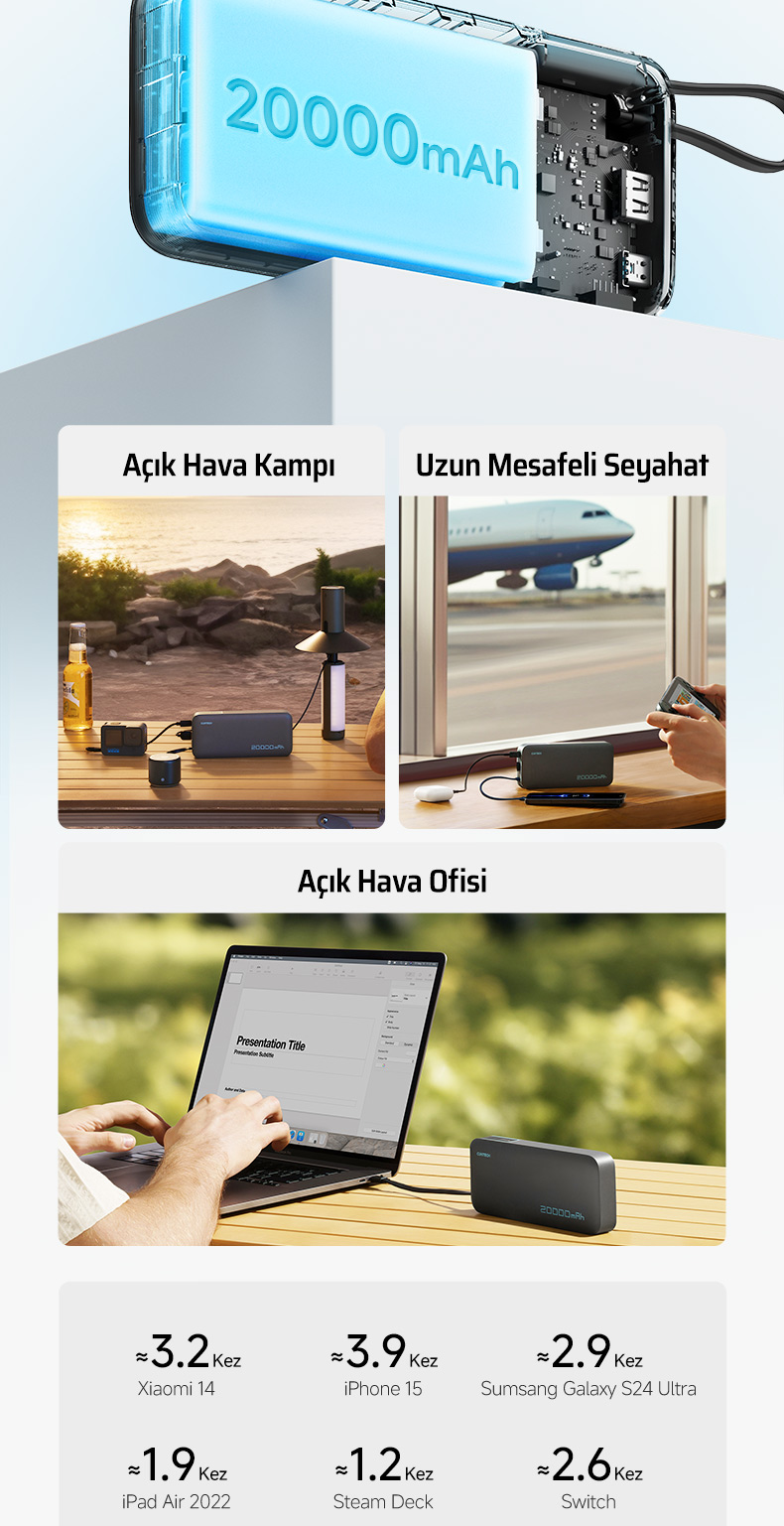 20.000 mAh Yüksek Kapasite – Gün Boyu Güç