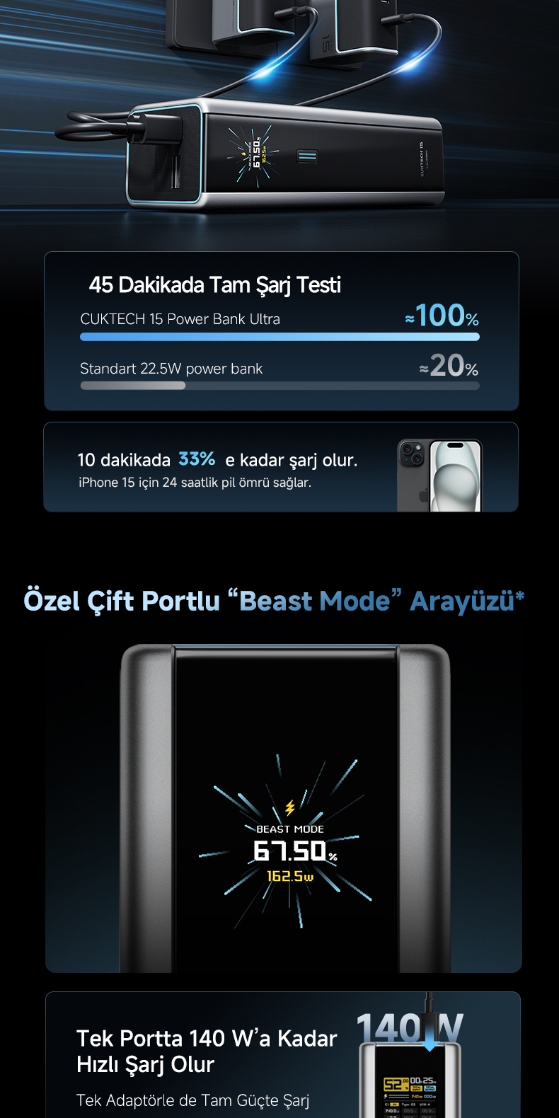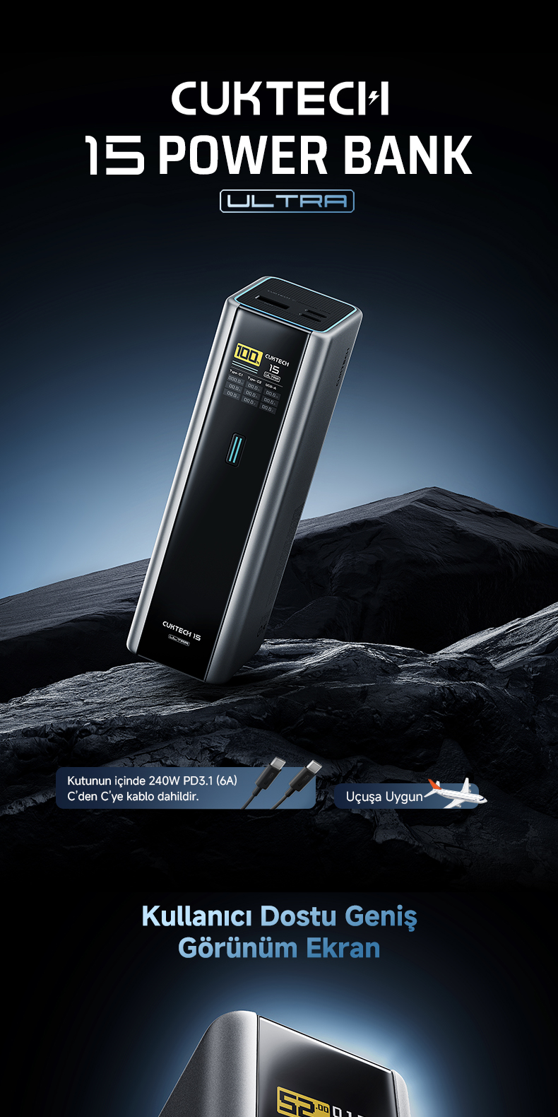 ⚡ CUKTECH 15 Ultra Powerbank 20000 mAh | 210 W Toplam Çıkış | 165 W Beast Mode | PD 3.1 | TFT Ekranlı Taşınabilir Şarj Cihazı