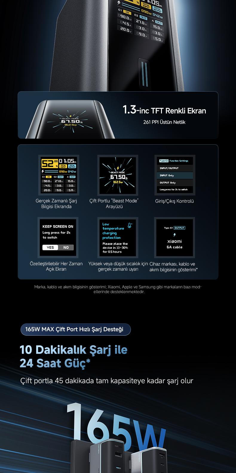 165 W “Beast Mode” kendi şarj kapasitesi, 210 W toplam çıkış gücü ve 20.000 mAh batarya kapasitesiyle, sınıfındaki en güçlü taşınabilir şarj cihazlarından biridir.