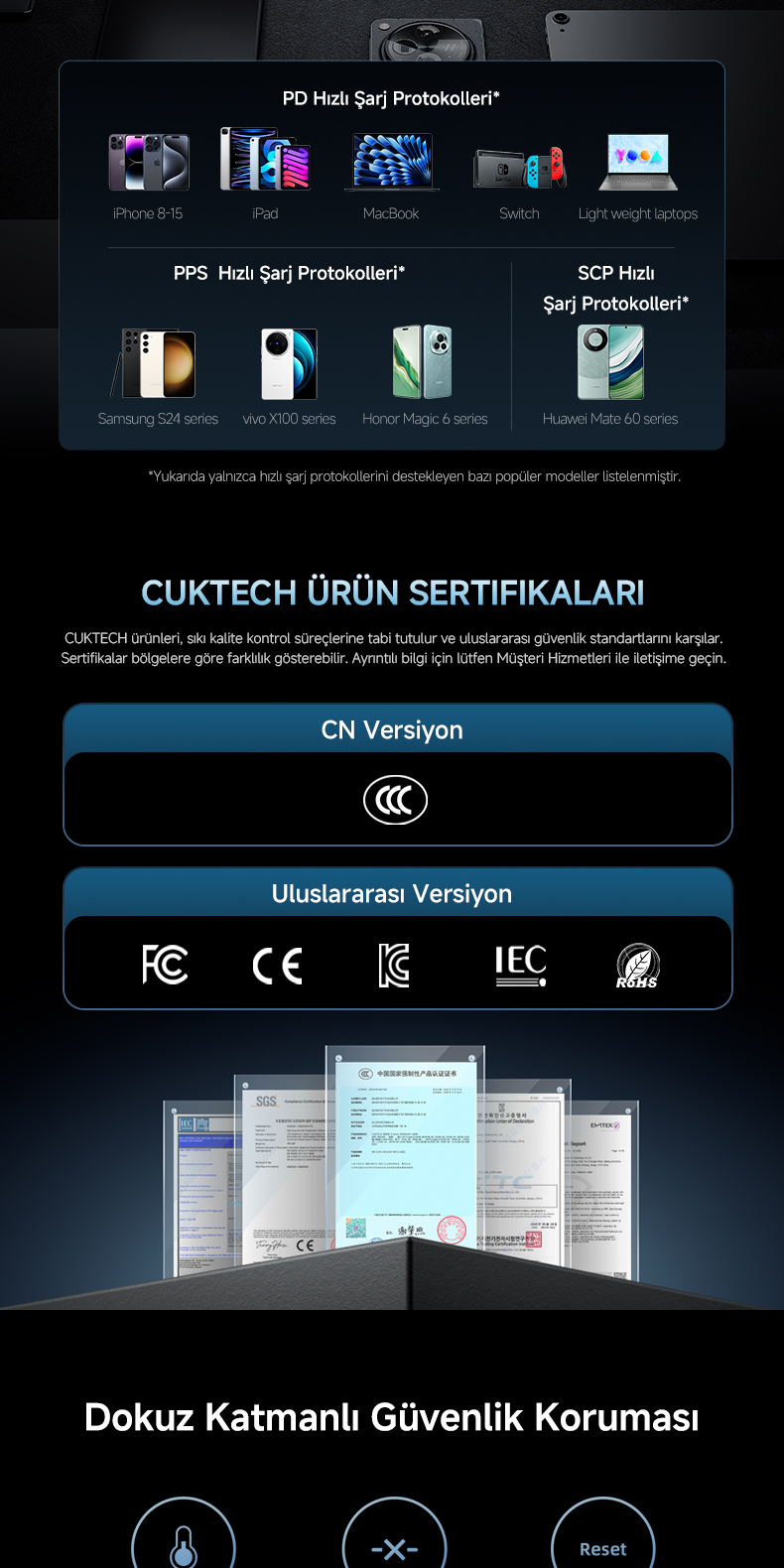 CUKTECH 15 Ultra; PD, PPS, QC, FCP, SCP, MiPPS protokollerini destekler.